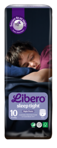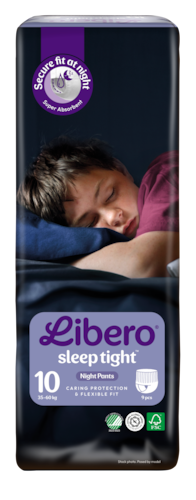 Libero SleepTight offers leakage protection for up to 12 hours for children weighing between 16-60 kg and in the bedwetting phase. Soft, stretchy elastic around the waist and legs for a perfect fit and leakage security. The pants have a discreet design with soft and gentle materials that let skin breathe. Recommended by Asthma Allergy Nordic and Nordic Swan Ecolabelled.